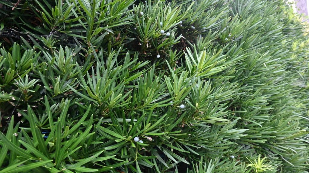O Podocarpo ou pinheiro-de-buda é perfeito para quem busca uma planta de crescimento moderado com presença imponente. Adequado para sol pleno ou meia-sombra, ele atinge alturas significativas, oferecendo um toque robusto e elegante ao jardim, sem a invasão de raízes agressivas ou espinhos.
