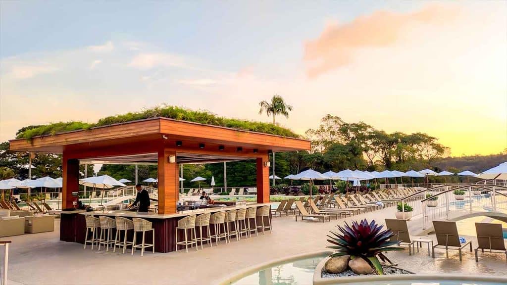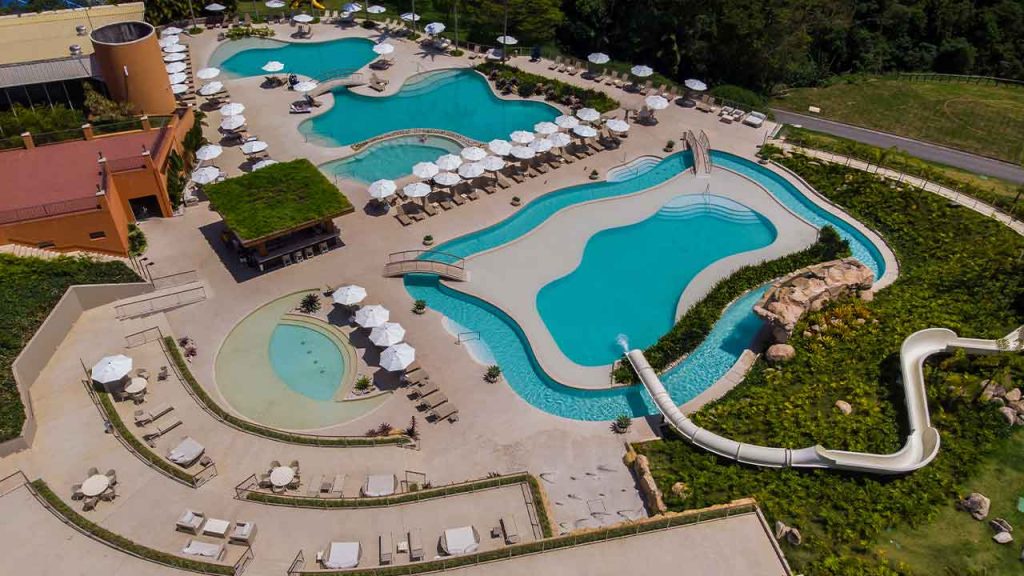 A área de lazer é um dos maiores diferenciais do hotel. O complexo aquático climatizado reúne piscinas para diferentes faixas etárias, incluindo uma piscina de 800m² com toboágua, além de piscina coberta aquecida com espaço adulto, infantil e jacuzzi.