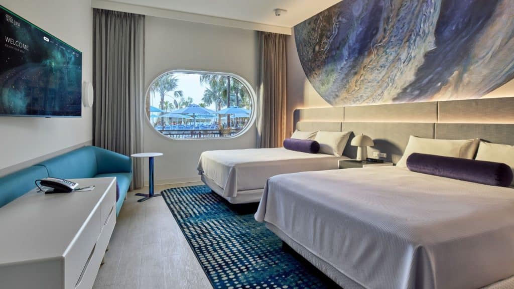 O Universal Terra Luna Resort não é apenas um local para descansar, mas uma verdadeira extensão do mundo fantástico da Universal. Cada um de seus 750 quartos foi projetado para proporcionar uma experiência imersiva, com uma decoração que remete a uma estação espacial, dando aos hóspedes a sensação de estar em um novo planeta. Os quartos são equipados com duas camas queen size, podendo acomodar confortavelmente até quatro pessoas, e grandes janelas que lembram as vistas das estações espaciais, permitindo que os visitantes relaxem enquanto admiram um cenário alienígena e futurista.