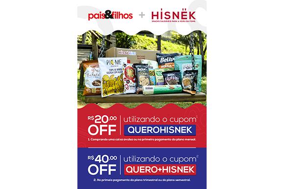 A Pais&Filhos uniu forças com a Hisnek e agora além de receber lanches saudáveis na sua casa, nossa edição do mês da revista irá junto. Além dessa novidade, através dos cupons abaixo, você consegue dois tipos de descontos: o primeiro de R$ 20, 00 no valor da primeira caixa no plano mensal ou na compra avulsa e o segundo de R$ 40,00 no valor do plano trimestral ou semestral. Muita coisa boa, né?