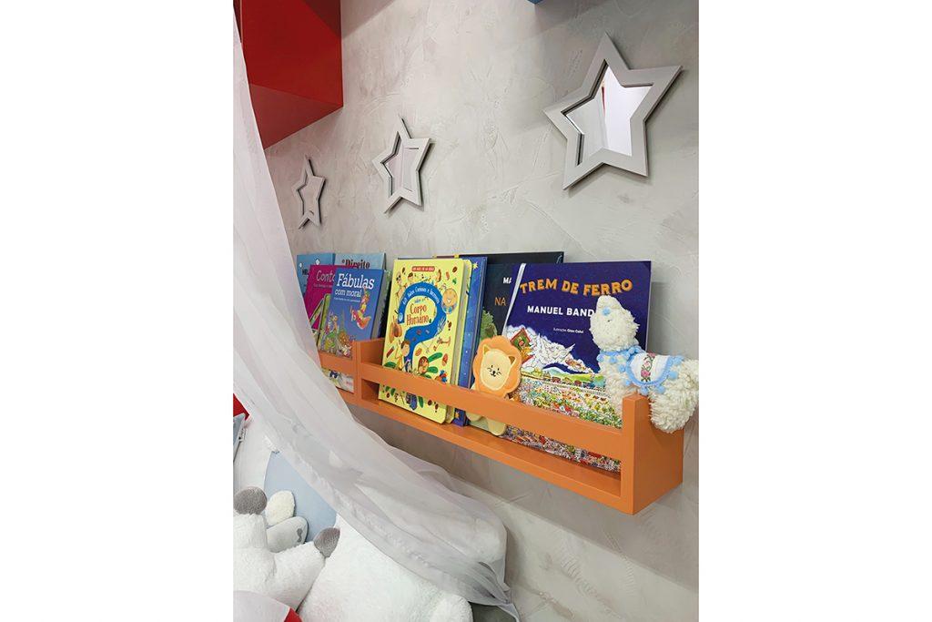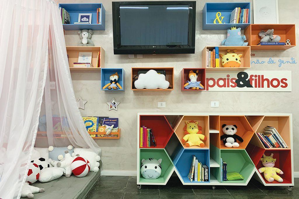 Ao lado da cabana cheia de almofadas, temos o espaço de leitura, com livros infantis selecionados a dedo.