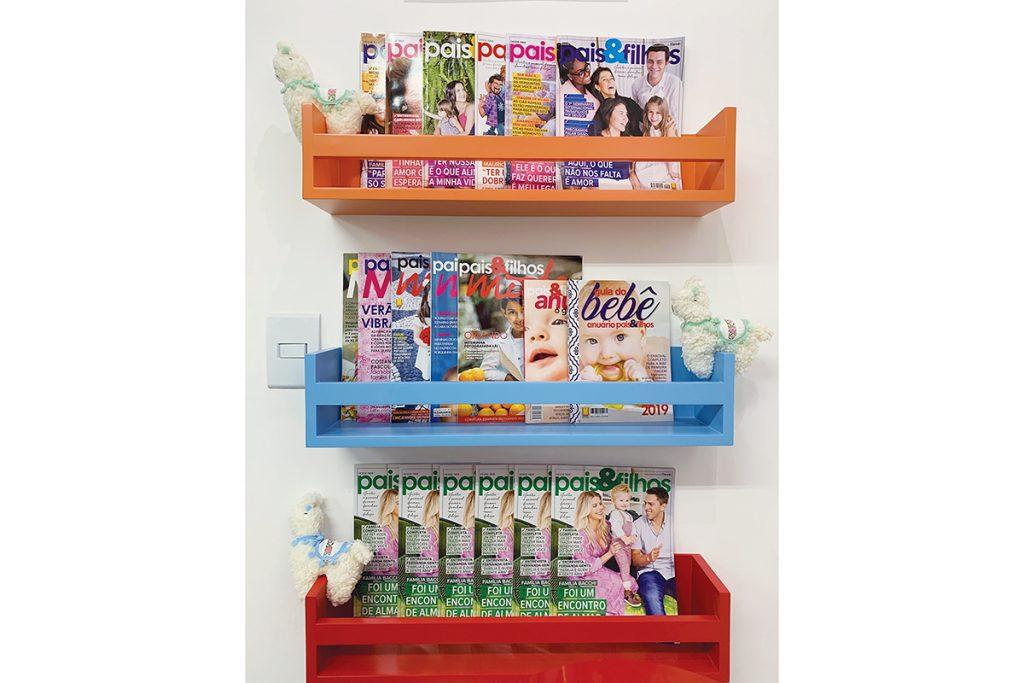 As estantes coloridas guardam (e mostram!) as revistas mais recentes e as edições especiais de Moda e Anuário.