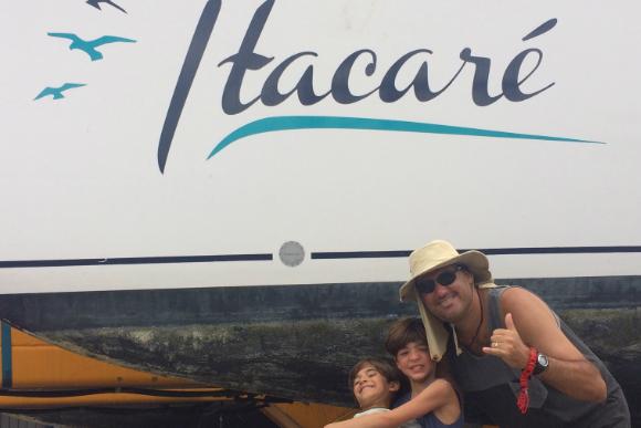 Minutos depois chegamos na Marina e paramos o barco em uma pequena entrada de concreto onde um mega trator estava nos esperando para nos tirar da água. Assim que chegaram, os meninos partiram para reconhecer o espaço e vasculharam por todos os cantos.