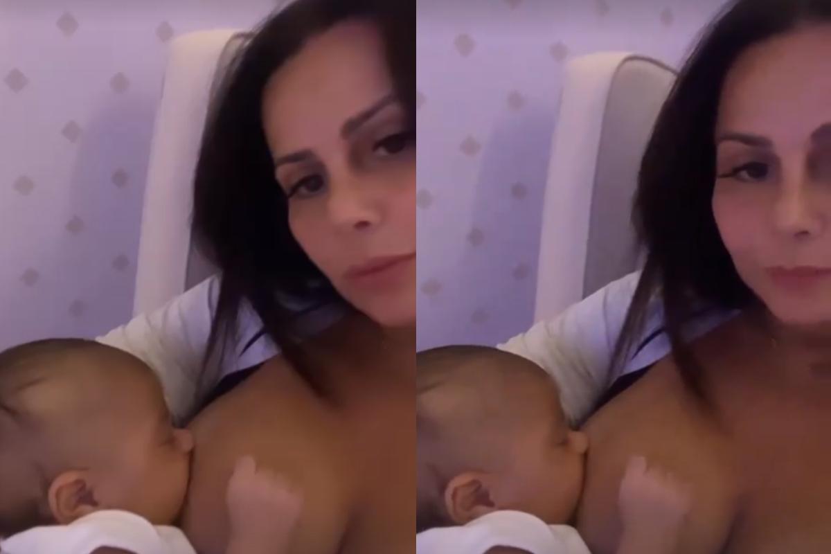 Além da foto publicada pela musa do Salgueiro, ela também apareceu amamentando o filho. “Agora eu já tomei meu banhinho, ‘tô aqui relaxando, né? Durmo mamando e é assim que eu fico. Mamo dormindo e durmo mamando [risos]”, brincou ela ao ‘imitar’ o filho.