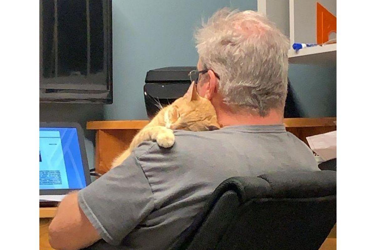Quando as filhas chegaram em casa com o gato, a resposta foi clara e objetiva: “Nós não podemos ficar com ele!”. Essa foto, tirada 10 meses depois, porém, mostra que a família não só ficou com o pet, mas como o pai se encantou pelo bichinho.