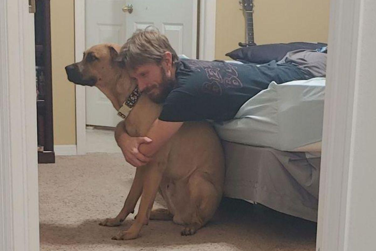 As filhas desse rapaz o pegou no flagra abraçando e cantando uma música que ele mesmo havia criado para o cachorro gigante que ele insistia que não queria!