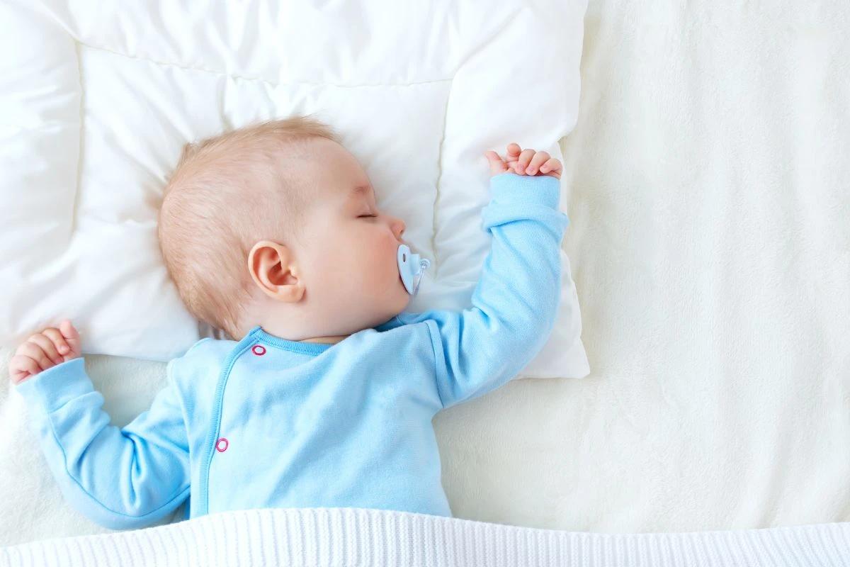 Bebê com chupeta e roupa azul dormindo com a cabeça de lado