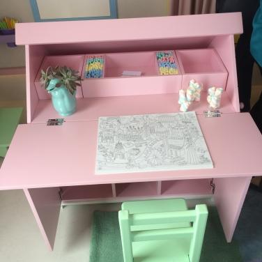 35 – Mesa para pintura com direito a um mural para prender os desenhos e potinhos para organizar os lápis.