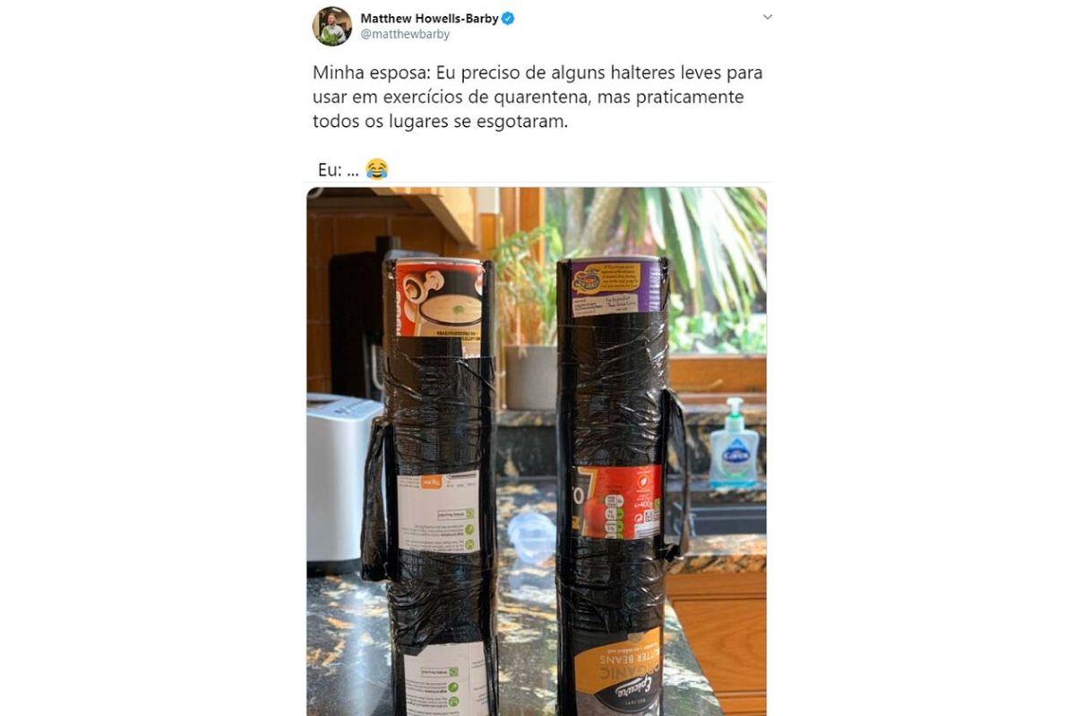 A esposa desse homem estava reclamando que gostaria de se exercitar em casa, mas não encontrava os ‘pesinhos’ para vender. Para agradá-la, ele usou coisas que tinham em casa para construir uns halteres para ela.