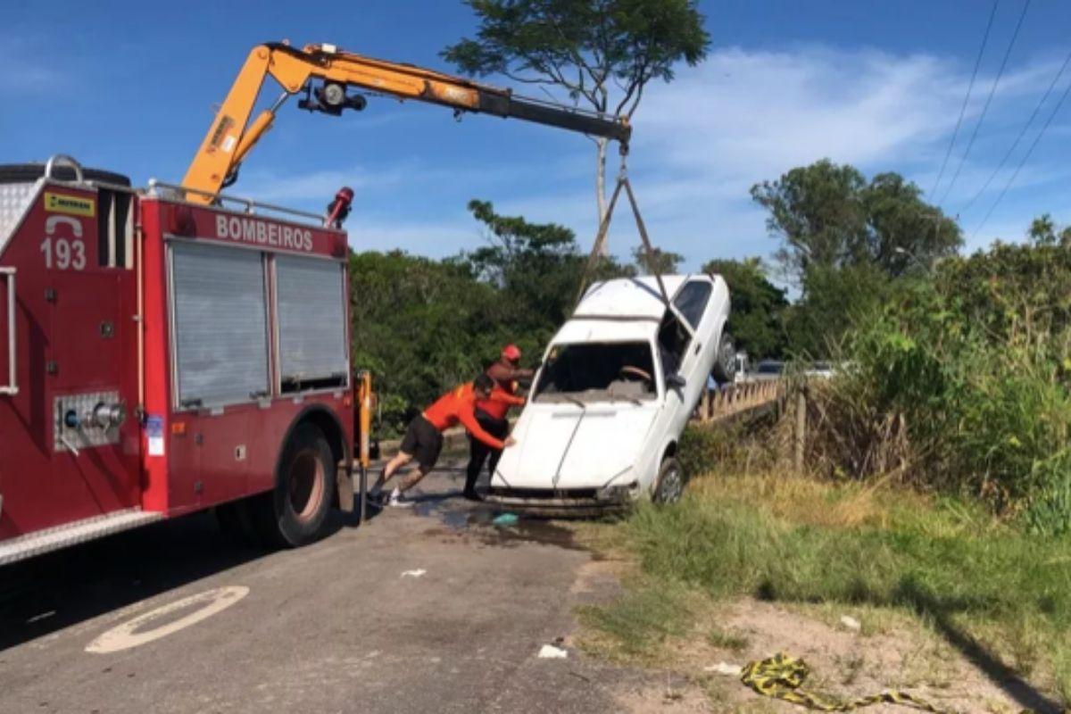 O carro caiu de uma ponte que passa por um córrego na RJ-208. De acordo com testemunhas, o motorista tentou desviar de um ciclista, perdeu o controle do carro e caiu dentro do rio.