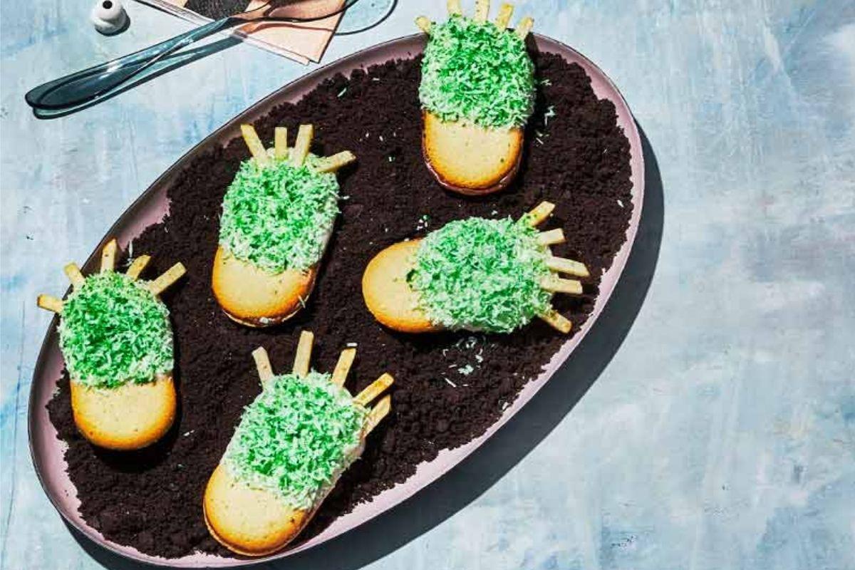 Coloque 1/2 xícara de coco ralado ou picado em um saco com zíper. Adicione 1/2 colher de chá de corante alimentício na cor verde. Feche o saco e misture até a fruta estar colorida. Derreta 1/2 xícara de gotas de chocolate meio amargo. Mergulhe pela metade 15 biscoitos de manteiga no chocolate derretido. Transfira para um pedaço de papel manteiga e polvilhe com o coco verde direto da sacola. Pressione batatas palha na base para fazer os dedos do pé. Deixe o chocolate endurecer. Sirva em uma tigela com biscoito de chocolate amassado.