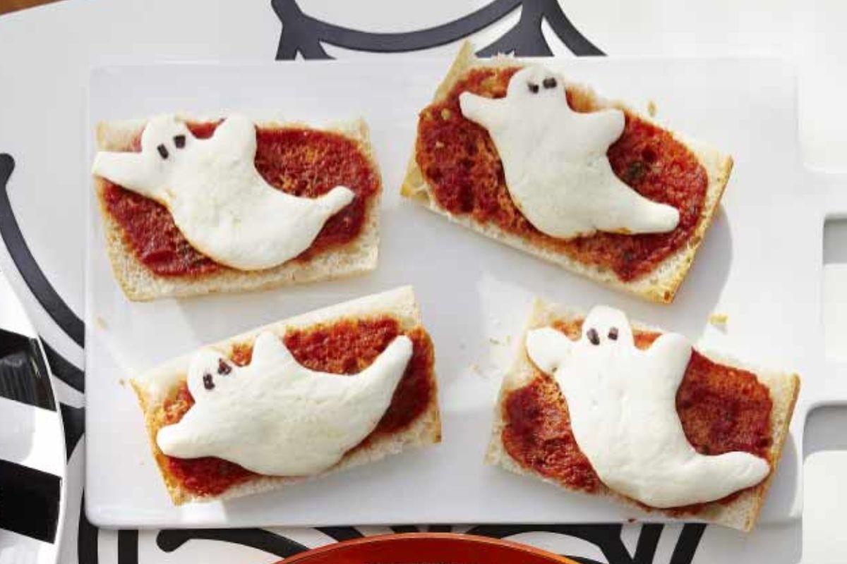 Pré-aqueça o forno a 200°C. Forre uma assadeira grande com papel alumínio. Apare as pontas arredondadas dos pães e corte cada um deles ao meio na horizontal. Coloque os rolos na forma preparada e deixe o lado do miolo para cima. Use a forminha para cortar cada fatia de queijo em forma de fantasma. Corte a azeitona em pedacinhos para fazer os olhos. Espalhe 1 colher de sopa do molho de tomate em cada metade de pão. Cubra com um fantasma de queijo. Pressione dois pedaços de azeitona em cada um para formar os olhos. Asse até que o molho esteja quente e o queijo comece a derreter, cerca de 7 minutos. Sirva quente.