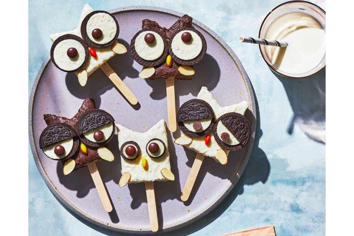 Forre uma forma quadrada com papel manteiga, deixando sobras nos dois lados. Derreta a manteiga numa panela em fogo médio-baixo. Adicione o saco de marshmallows e mexa até derreter completamente. Misture 6 xícaras de cereal com um pouco de sal. Com as mãos untadas de manteiga, pressione a mistura na forma preparada, revestindo-a. Leve à geladeira por pelo menos 1 hora e, em seguida, transfira a forma com o cereal para uma mesa e corte tudo em 12 pedaços retangulares. Espete palitos de sorvete em cada uma das partes. Corte uma das laterais do retângulo em formato de “V” para criar a orelha das corujas. Derreta uma barra de chocolate escuro ou branco. Em seguida, molhe os retângulos na calda até que cubra tudo. Enquanto o chocolate ainda está molhado divida uma bolacha recheada no meio e coloque um MMs no meio, grudando os dois no retângulo lambuzado. Assim, as corujas terão ganhado olhos. Adicione 2 amêndoas fatiadas para as asas. Refrigere até estar pronto para servir!