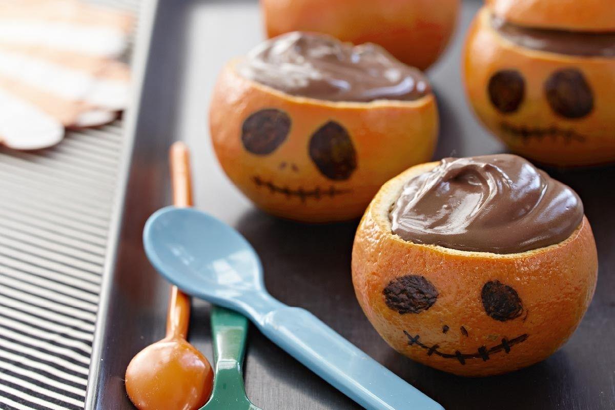 Bata em uma tigela 6 colheres de sopa de cacau em pó com a mesma quantidade de açúcar e 1/2 colher de chá de sal. Aqueça 4 xícaras de leite em uma panela pequena em fogo médio-baixo até que borbulhe nas laterais. Depois, adicione o cacau e misture. Divida o líquido entre seis xícaras feitas da casca da laranja ou de abóbora. Corte os marshmallows ao meio e adicione. Desenhe olhos e rostos na casca.