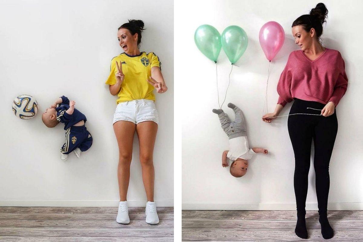 Uma outra possibilidade super fácil de recriar em casa é abusar da criatividade para montar cenas com o bebê deitado. Para isso, basta escolher o tema com base nas coisas que já tem em casa. O próximo passo é escolher um local onde o chão é liso – preferencialmente branco. Deite o bebê e posicione todos os detalhes da foto. Depois de tirada, basta inverter a imagem em um editor, para parecer que seu filho está voando ou pulando.