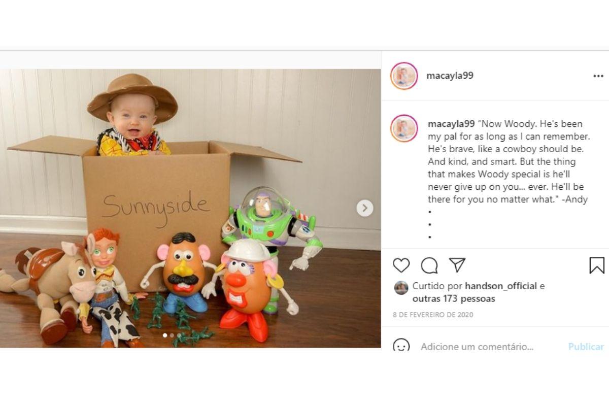 Para fazer esse ensaio, você vai precisar reunir todos os brinquedos com o tema de Toy Story que puder encontrar em casa! Vale pedir para as amigas e lotar a sala – quanto mais opções, mais fotos diferentes você vai conseguir tirar! Além dos brinquedos, busque uma caixa de papelão grande para montar a cena e brincar com a história do filme. Feito isso, basta usar a criatividade para montar a pose. A dica é tentar deixar sempre seu filho o mais confortável o possível!