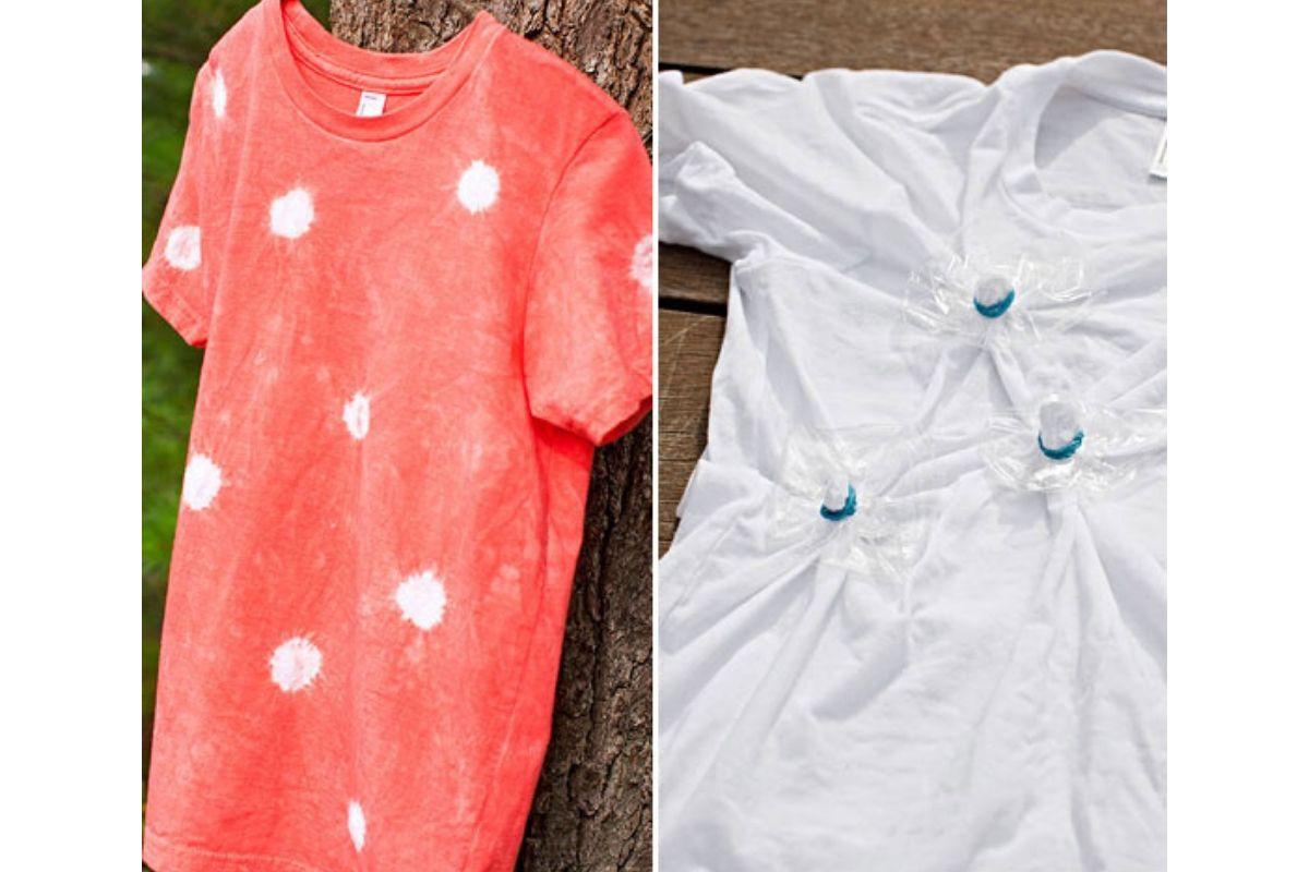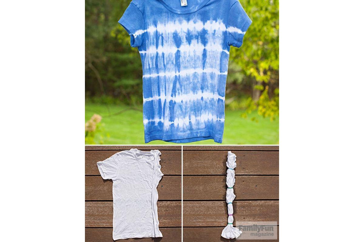 Mesmo crianças pequenas podem ajudar a criar esse design cósmico de tie-dye. Primeiro, molhe a camisa e coloque-a no lugar. Com os dedos, amasse e enrugue o tecido, juntando-o em um disco rígido. Enrole várias faixas de borracha ao redor do disco. Quanto mais apertado, mais branco ficará na camiseta final.