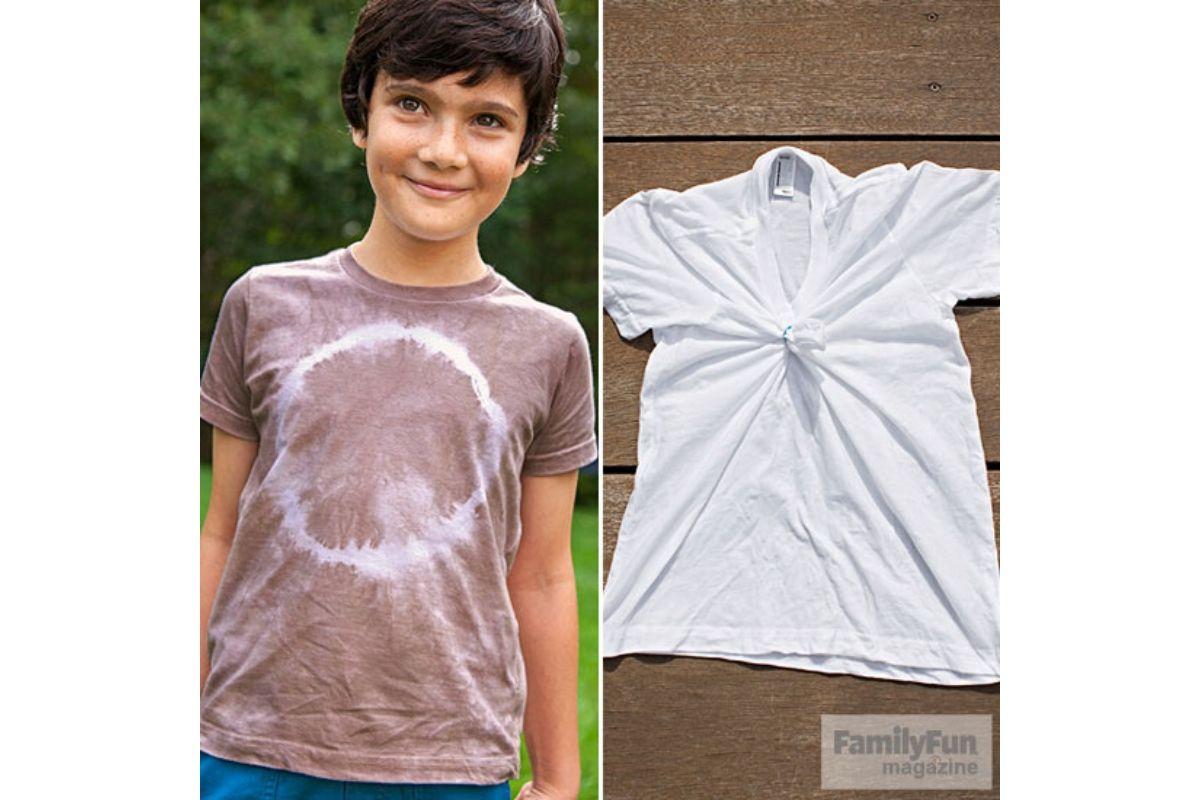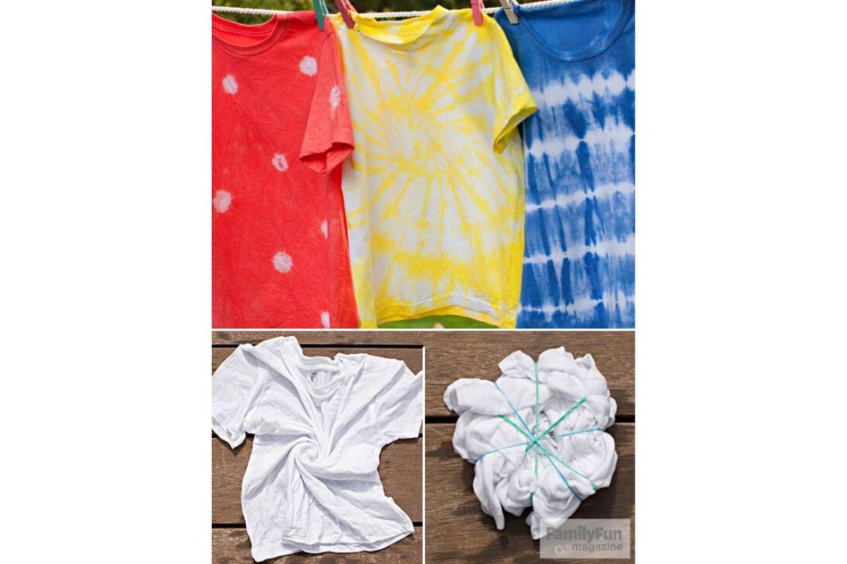Esse padrão em espiral (mostrado na camisa amarela) fará com que você e seus filhos façam a torção. Escolha um ponto no centro da camisa, entre as axilas; com o polegar e o indicador, pressione e torça o tecido no sentido horário. Tente manter as dobras resultantes aproximadamente na mesma altura, criando uma forma como um rolo de canela. Enrole a forma firmemente com elásticos, como mostrado. Quanto mais apertado você amarrar a camisa, mais branco haverá no design.