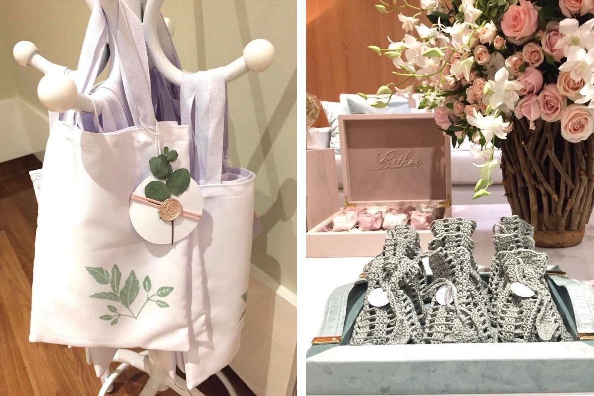 Itens personalizados dão aquele charme pra lembrancinha. No caso de Esther, os visitantes receberam saquinho em crochê com chocolate belga e sacolinha para que pudessem colocar suas lembranças e doces.