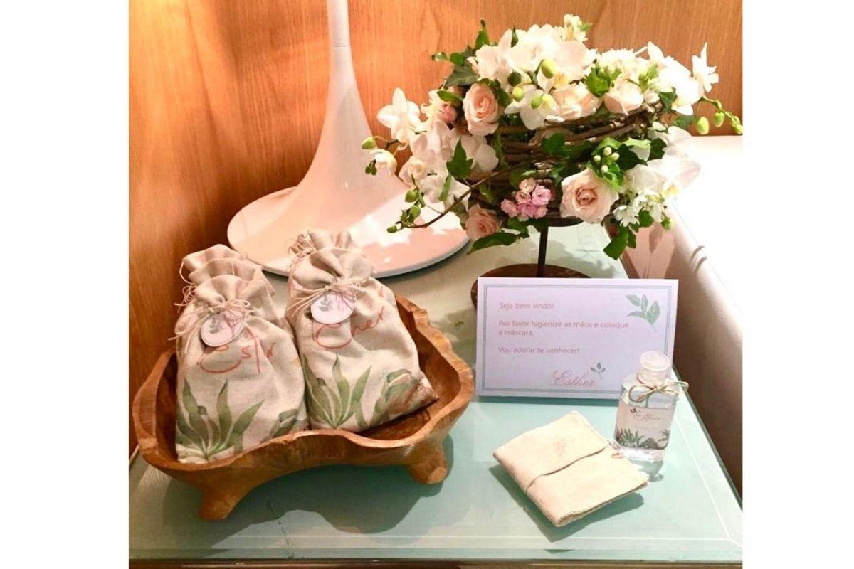 Logo na entrada, o Welcome Kit (lembrança muito útil) com uma plaquinha solicitando a visita que coloque a máscara personalizada e higienize as mãos. Sempre bom lembrar, não é mesmo?