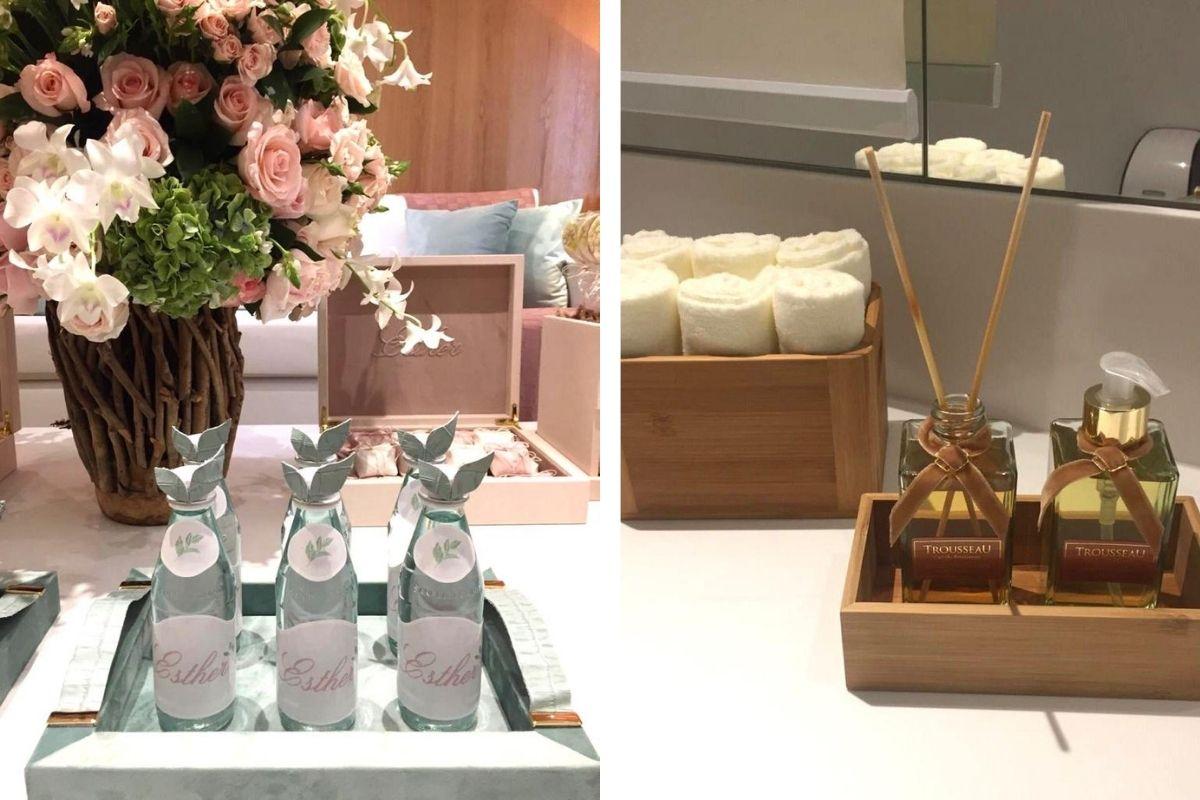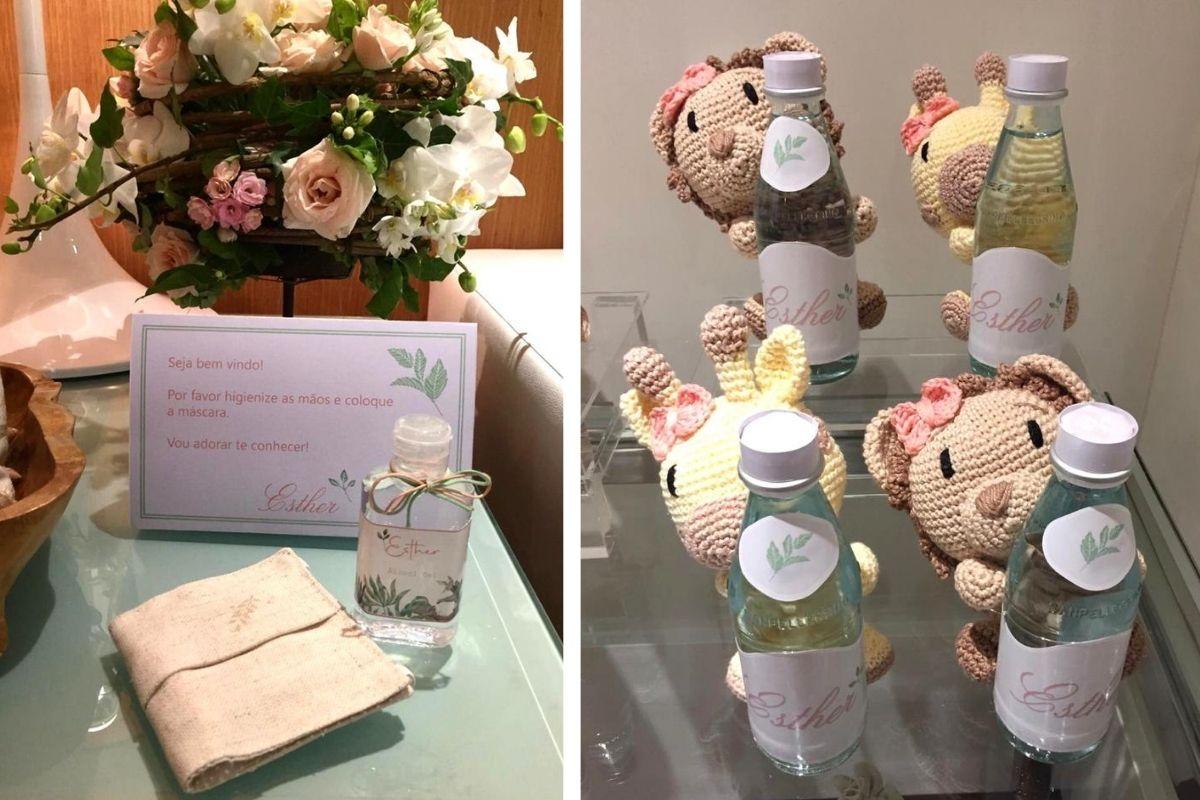 O tema escolhido por Carol e Kaká foi floresta suave e os tons pastel tomaram conta, assim como a decoração do quarto da bebê. Todos os presentes estão em um kit feito de linho, camurça e couro. Nele, as visitas recebem diversas surpresas, e logo na entrada tem o ‘Welcome Kit’ com uma plaquinha solicitando que a pessoa coloque a máscara personalizada e higienize as mãos. Doces, balas, águas e almofadas perfumadas também fazem parte das lembrancinhas.