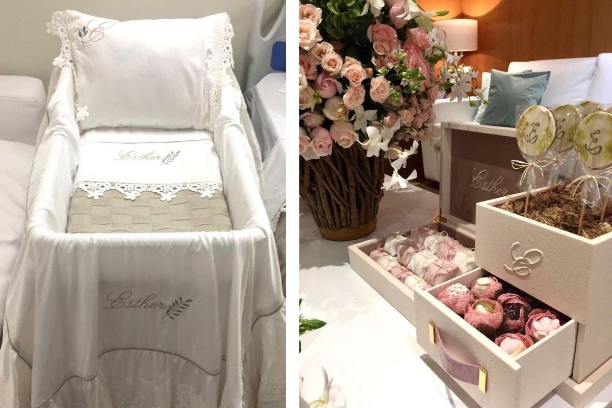 No cantinho de Carol e Esther o destaque ficou por conta do Enxoval completo e personalizado para a cama da mãe e bebê.