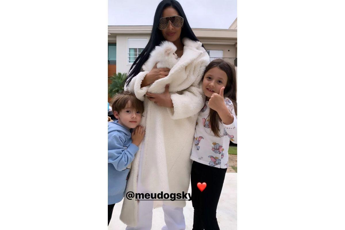 Pelos stories, no Instagram, a cantora disse que os filhos ganharam uma cachorrinha da raça Spitz Alemão Anão, avaliado entre R$ 1,5 mil a R$ 2,5 mil. “O novo integrante da família! Que coisa linda, não é, minha filha? Oi Sky! Olhe aqui, Sky”, brincou Simaria com o filhote.