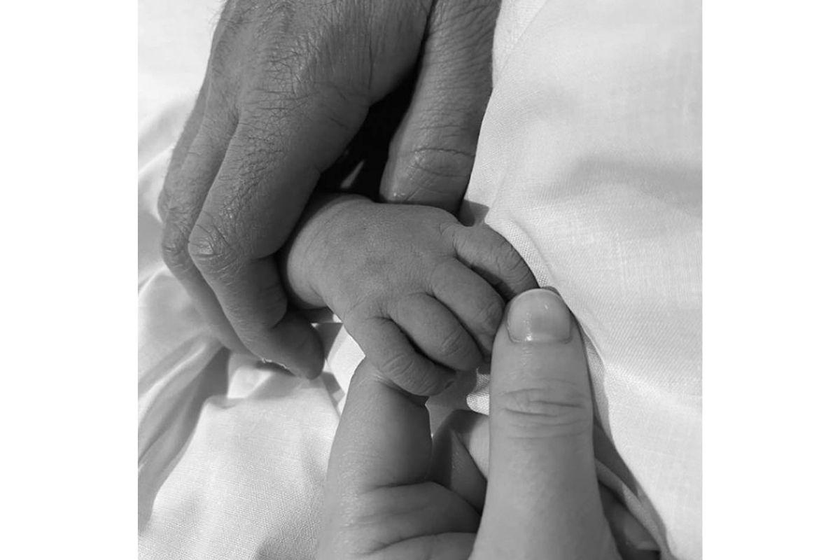 A orgulhosa mãe de primeira viagem legendou o clique com três corações azuis logo após parir o bebê no hospital de luxo – o mesmo que Meghan Markle deu à luz Archie.