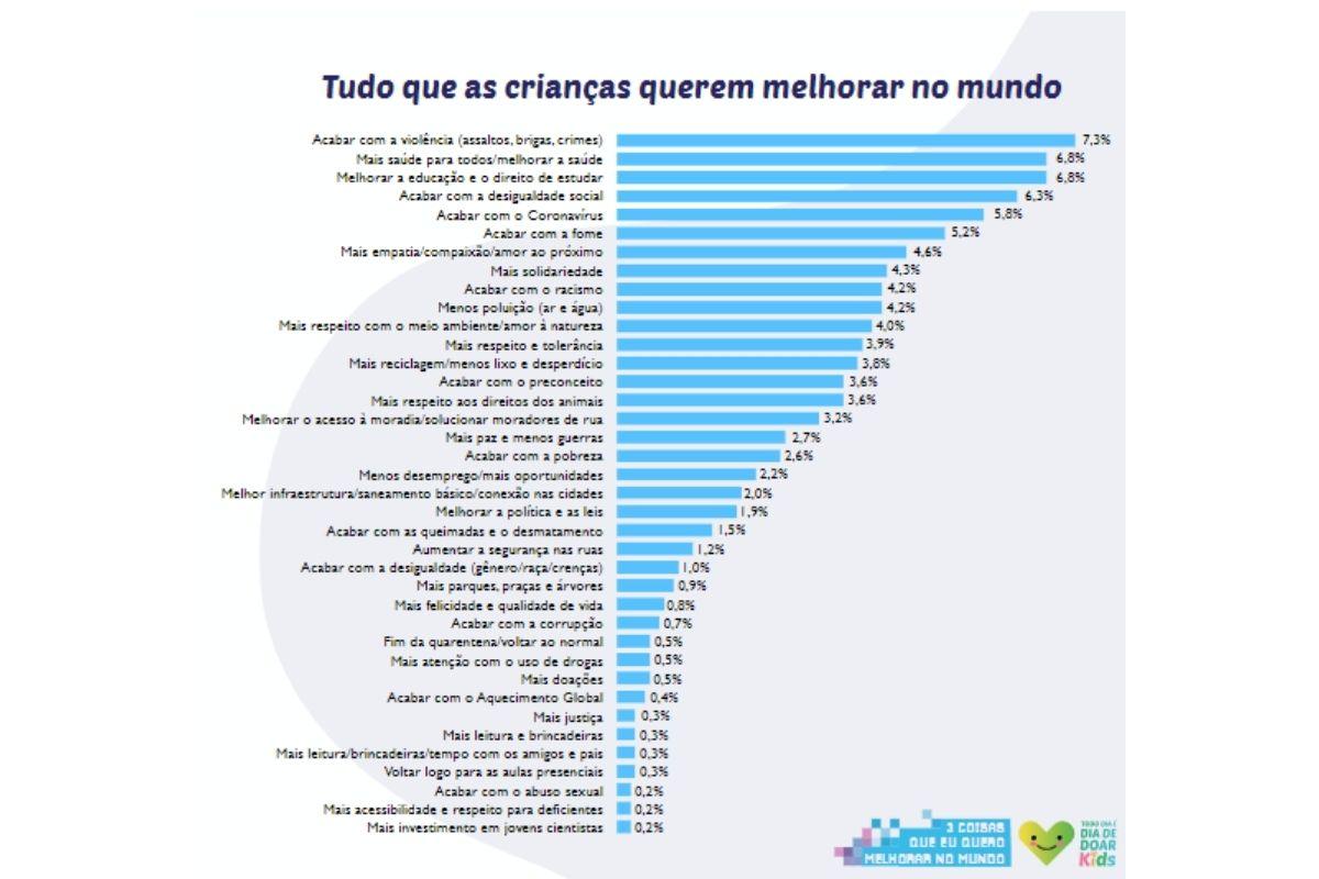 Segundo os pesquisadores, a primeira resposta dadas pelas crianças tende a ser sobre algo que elas têm medo ou receio de que aconteça. Entre as cinco conclusões mais faladas estão “acabar com o coronavírus”, “melhorar a educação”, “acabar com a violência”, seguido por “melhorar a saúde” e “aumentar a reciclagem/ menos lixo e desperdício”. A Dar de Doar explica que são todas questões concretas e visíveis, que costumam aparecer principalmente no noticiário.