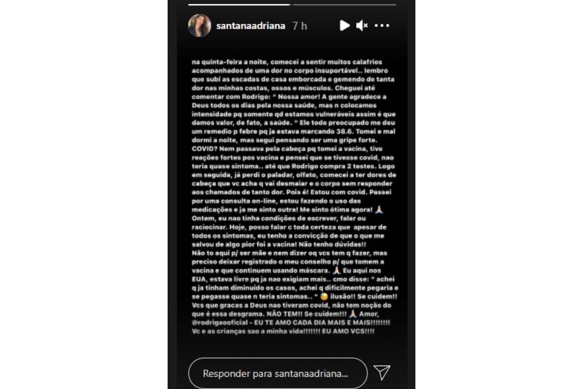 Aos fãs, Adriana Sant’Anna pediu que continuassem se vacinando, pois acredita que a vacina a salvou de algo pior. “Não tenho dúvidas. Não estou aqui para ser mãe e nem dizer o que vocês tem que fazer, mas preciso deixar registrado o meu conselho para que tomem a vacina e que continuem usando máscara. E aqui nos EUA estava livre, porque não exigiam mais… Como disse: ‘achei que já tinham diminuído os casos, achei que dificilmente pegaria e que se pegasse, quase não teria sintomas’. Ilusão! Se cuidem!”, concluiu.