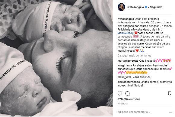 Vevete decidiu compartilhar a emoção com a gente, e até agradeceu seus seguidores por todo carinho que recebeu durante a gestação: “Deus está presente fortemente na minha vida. Só quero dizer a ele: obrigada por essas bênçãos. A minha felicidade não cabe dentro de mim. @danielcady, nosso sonho está só começando. A todos, o meu carinho por tantas demonstrações de amor e desejos de boa sorte. Cada oração de vcs chegou, e nossas meninas são muito maravilhosas!”.