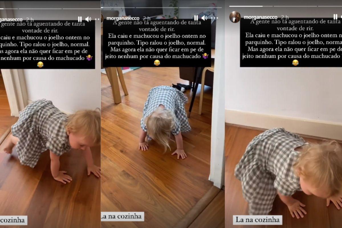 “A gente não tá se aguentando de rir”, comentou Morgana, em vídeo publicado no Instagram. “Ela caiu e machucou o joelho ontem no parquinho. Tipo, ralou o joelho, normal. Mas agora ela não quer ficar em pé de jeito nenhum por causa do machucado”.