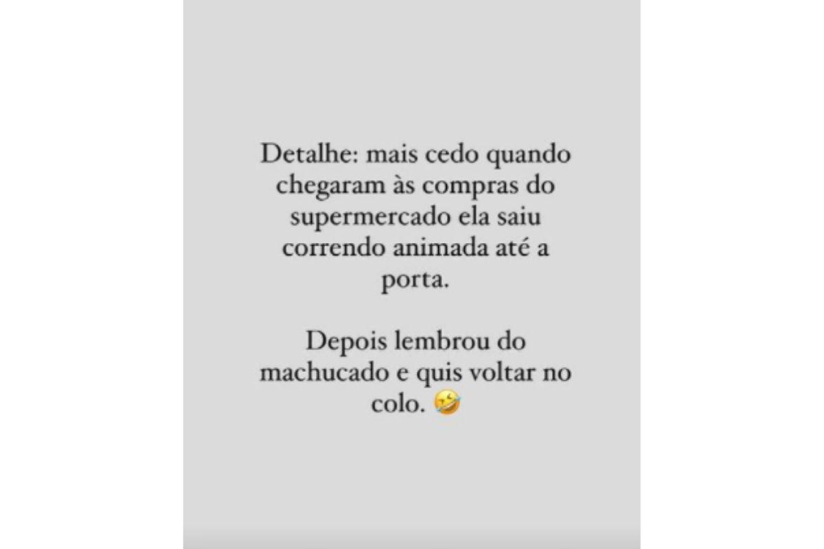 “Detalhe: mais cedo quando chegaram as compras do supermercado, ela saiu correndo animada até a porta. Depois lembrou do machucado e quis voltar no colo!”, brincou Morgana, sobre a atitude da filha.