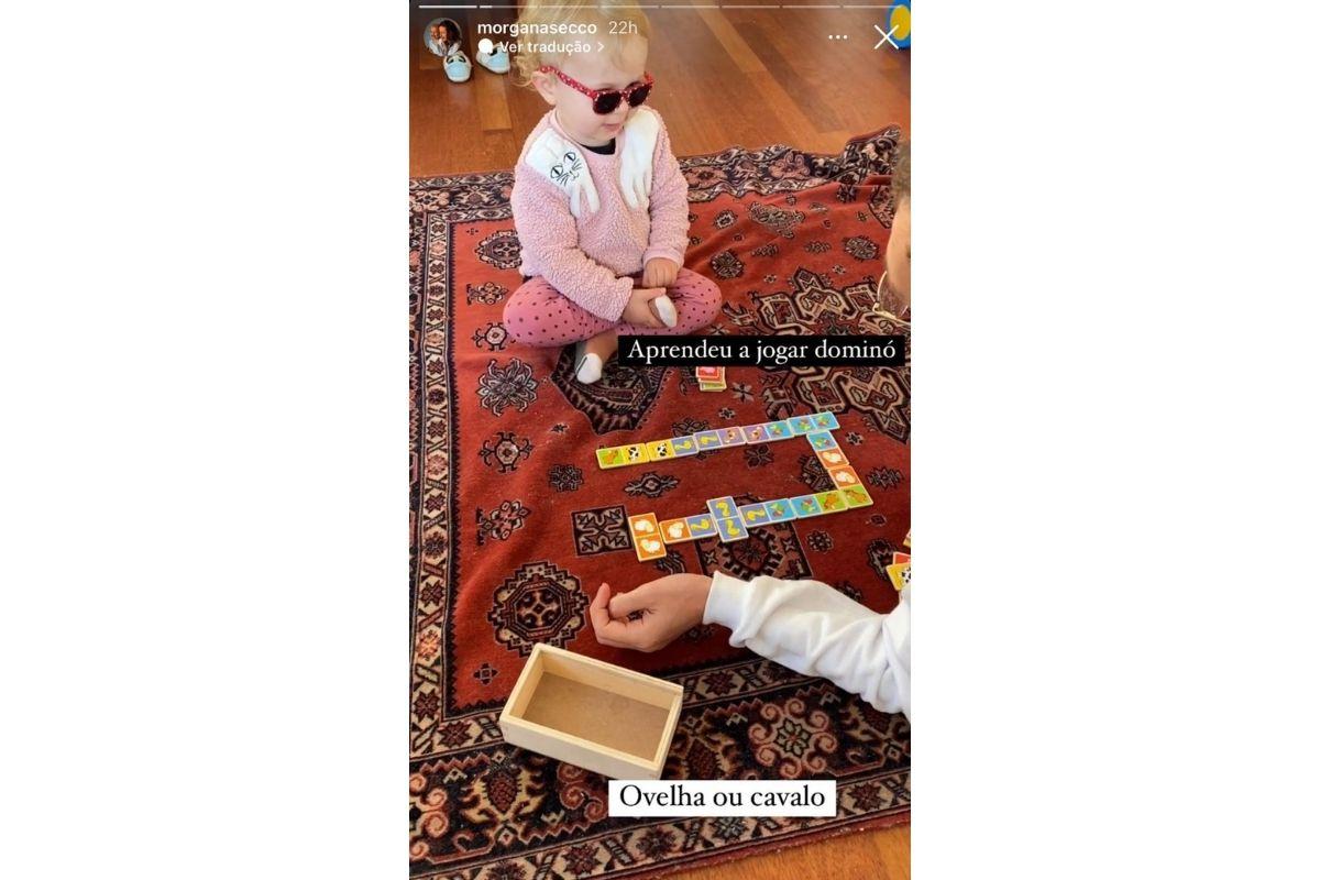 Com fotos e vídeos nos stories, Morgana mostrou Alice sentada em um tapete ao lado dela e do pai. Usando um óculos escuros, ela brinca com as peças do jogo que são personalizadas e próprias para a idade dela – em vez de bolinhas nas pontas, eles têm imagens de animais, como porco e cavalo.