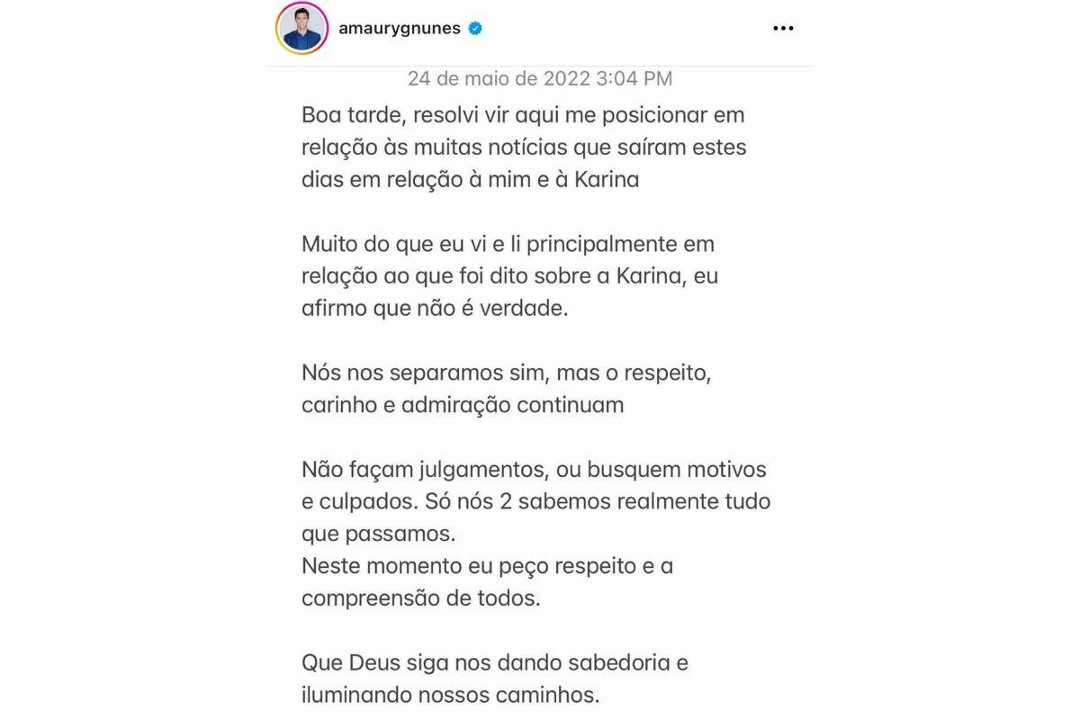 O empresário Amaury Nunes, de 39 anos, deu um recado nas redes sociais para se pronunciar sobre o divórcio entre ele e a apresentadora Karina Bacchi. O anúncio da separação foi feito na semana passada, porém, até o momento, Amaury não tinha se pronunciado a respeito ainda. Ele pediu também respeito para os seguidores nessa fase a vida tanto dele como de Karina.