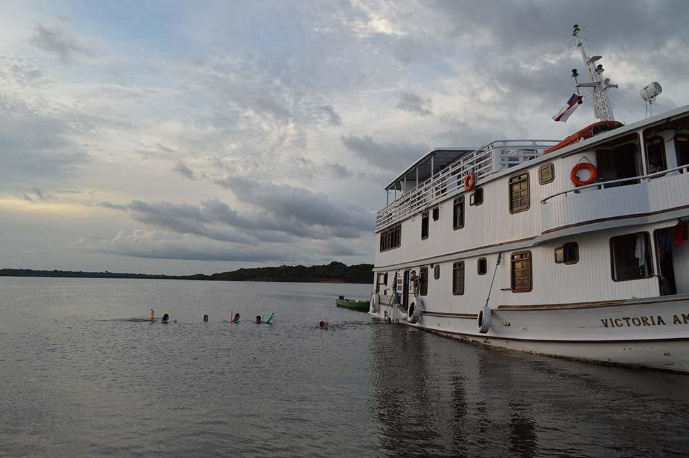 Mas vamos voltar ao inicio, na chegada a Manaus, ainda na madrugada. Após 5 horas de voo, vagamos, eu e o grupo quase completo, ainda sem nos conhecermos, por uma cidade quente e silenciosa, até o atracadouro onde estava nosso barco. Achei minha cabine, devidamente identificada com meu nome. As instalações são simples, mas com os itens básicos de conforto: ar condicionado, banheiro privativo, colchão macio e limpeza nota 10. Nem preciso dizer que adormeci em 5 segundos, certo? Mas o que ficou na memória foi acordar já com sol e ver o rio pela janela. Rio? Mar!!! Um mar escuro, sem ondas, infinito…