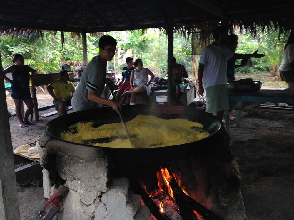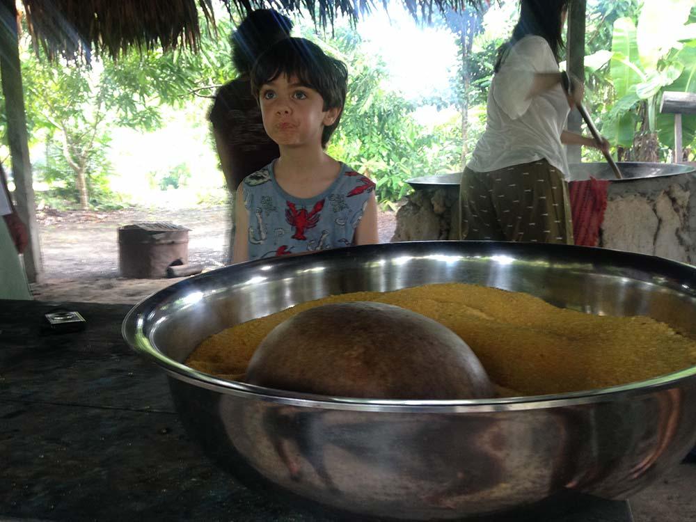 E foi com artesanato que começamos. Todos puderam escolher um tema e fabricar sua própria lembrança. Ainda tenho a tornozeleira que fiz. Ficou bonita, mas o mérito é todo da professora. À tarde passamos no engenho de farinha, onde se faz também tucupi, biju e tapioca. A farinha é item essencial: café da manhã, almoço e jantar, tudo leva esse ingrediente. E tudo que é fabricado no engenho, é consumido na comunidade.