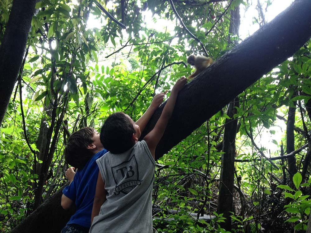 Após a vista magnífica, fomos tomar café e receber as instruções iniciais enquanto. Nossa primeira parada seria o Lago Janauary, onde desceríamos para uma trilha. Aqui vale lembrar, novamente, das aulas de geografia. A Amazônia é uma grande planície. Assim,o caminho é tão suave quanto zanzar pelas calçadas da avenida Paulista. Exceto pelo fato de vários macacos de cheiro virem ao nosso encontro, provavelmente já sabendo que tínhamos comida. Nem os gritinhos de Leon, Beatriz, Brena e Izaque, as crianças do grupo, foram capazes de espantar nossos novos amigos.