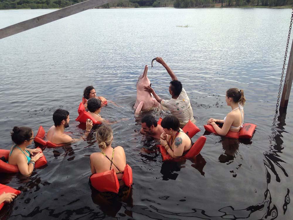 À tarde, o programa mais inacreditável da viagem: ver botos cor-de-rosa. A proposta não é ir em parque temático, ou em piscinas com bichos confinados, e sim ficar na natureza. Então, achei eu, seria uma completa loteria. Mas há um trabalho sério de manejo de botos no rio Negro. Em um tipo de baía, completamente livres para ir e vir, eles são monitorados e estudados. Mas, assim como os macaquinhos da trilha, eles sabem que ali tem comida fácil. E aí a mágica acontece!!!! Somos avisados que carinho na cabeça e na barbatana dói, mas que na barriga tudo bem. E que não é parque aquático, então nada de se agarrar para sair nadando com eles. Sim, tive o privilégio de dar carinho em um boto cor-de-rosa e ele é MUITO fofo!!!! E as crianças, claro, ficavam extasiadas!