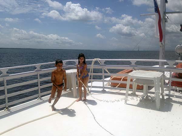 Nesse momento você deve estar pensando: e as crianças? Os pequenos estavam completamente integrados entre si e com a comunidade do barco. Leon, filho de Telma e Guilherme, costuma viajar com os pais. Já havia ido para a Ilha de Marajó, para Lisboa e até para o Etna!!! Melissa, mãe de Beatriz, escolheu a viagem exatamente pela experiência de ver algo completamente diferente. E Izaque e Brena, filhos de Diná, são da cidade ao lado e conhecem todos os detalhes do barco. Além disso, havia sete tripulantes, o guia e 18 adultos no grupo e todos, sem exceção, estavam de olho. Seja para ajudar a entrar e sair do barco, nadar com eles no rio, tomar banho mangueira, roubar melancia na cozinha… Acho que, na verdade, todo mundo era criança novamente.