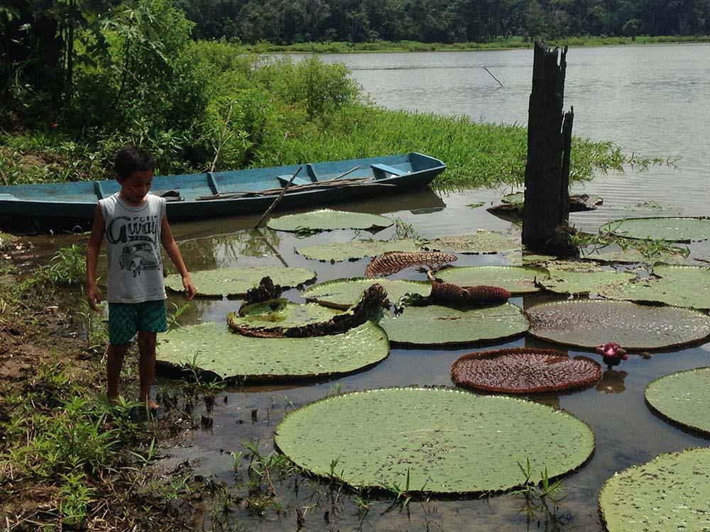 Assim, ora sozinhos ora com macaquinhos ao nosso redor, avançamos mata adentro. A primeira parada,  uma árvore centenária, daquelas que o grupo teria que dar as mãos para rodear. A segunda, uma lagoa repleta de vitórias-régias, uma flor mais delicada do que eu supunha, já que precisa sempre estar com as raízes bem fixas no fundo do lago. Nesse ponto um aviso importante: a história de que as folhas são capazes de suportar um humano não passam de lenda. Minha foto clichê ficou apenas na imaginação.