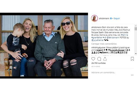 Ana Hickmann começou a terça-feira (18) compartilhando em seu Instagram uma foto em família. A apresentadora voltou para sua cidade natal, Santa Cruz do Sul, no Rio Grande do Sul, junto com seu filho de 4 anos, Alexandre, seu marido, Alexandre Correa, e sua irmã, Fernanda. A foto tem um motivo muito especial: a comemoração do aniversário de seu avô.