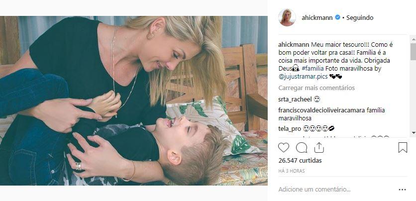 Alexandre é fruto do casamento de Ana com o empresário Alexandre Correa. Na imagem, ela está segurando o filho no colo, com um sorrisão. “Meu maior tesouro! Como é bom poder voltar para casa! Família é a coisa mais importante da vida. Obrigada Deus”, escreveu na legenda.