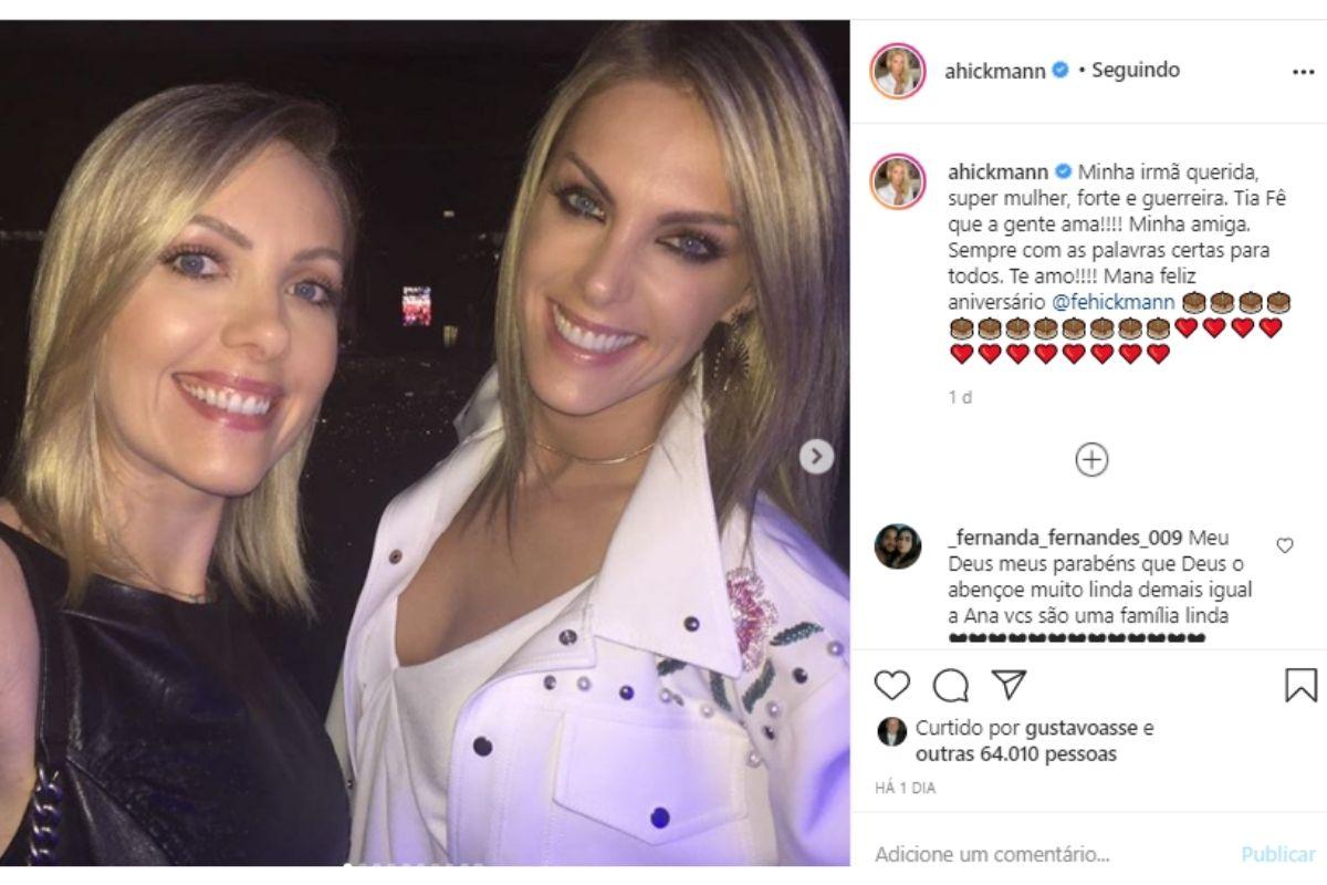 A apresentadora Ana Hickmann usou as redes sociais para fazer uma homenagem para a irmã, Fernanda Hickmann, no dia do aniversário dela. Junto com a declaração, a apresentadora compartilhou algumas fotos das duas juntas. “Minha irmã querida, super mulher, forte e guerreira. Tia Fê que a gente ama!!!! Minha amiga. Sempre com as palavras certas para todos. Te amo!!!! Mana feliz aniversário”, escreveu ela ao compartilhar.