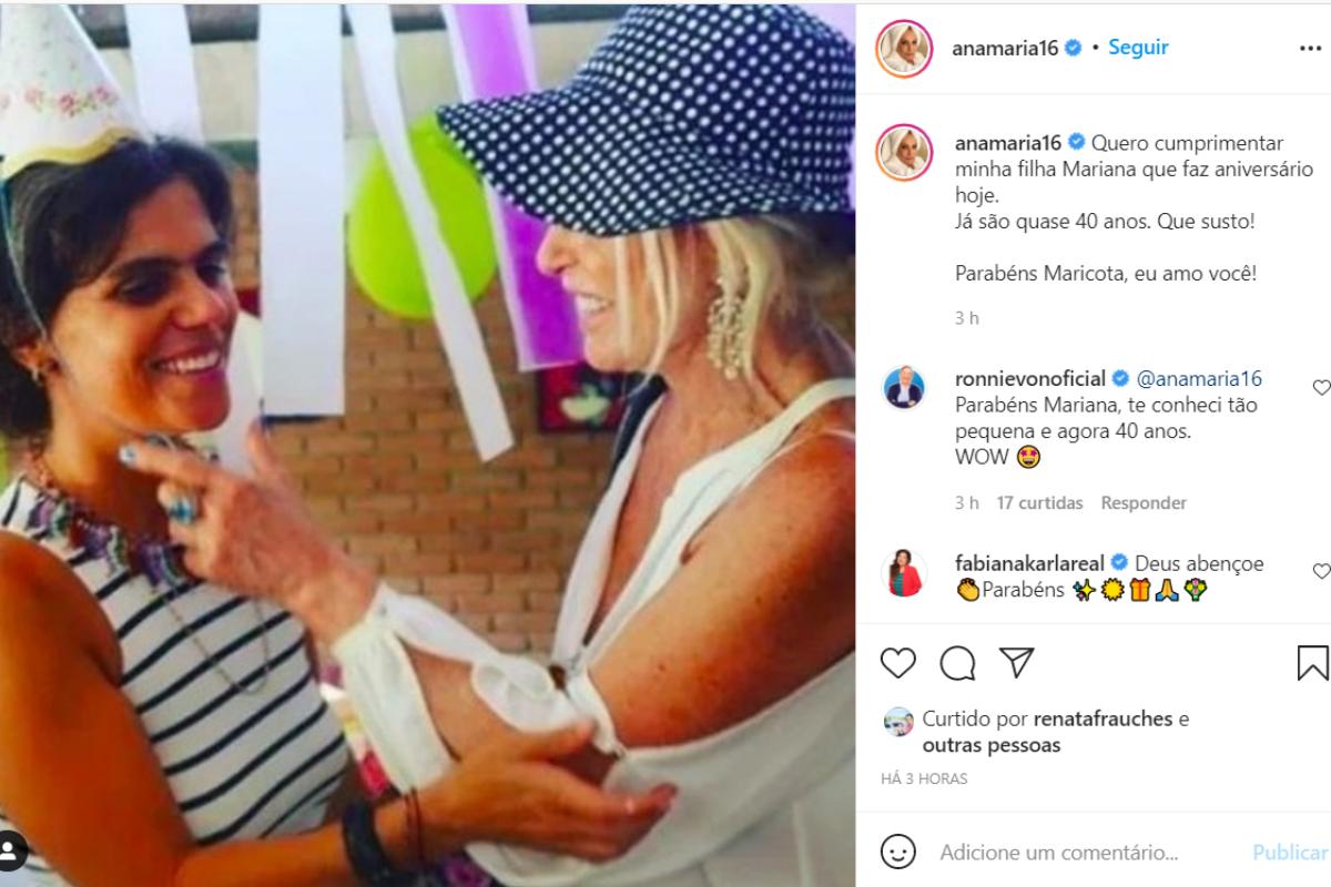 “Já são quase 40 anos. Que susto! Parabéns Maricota, eu amo você!”, finalizou Ana Maria no texto. Artistas e colegas de profissão parabenizaram Mariana. “Parabéns Mariana, te conheci tão pequena e agora 40 anos. WOW”, escreveu o cantor Ronnie Von. “Deus abençoe. Parabéns “, desejou a atriz Fabiana Karla.