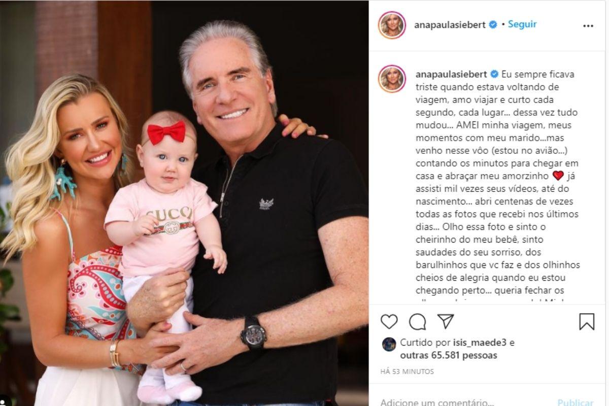 Ana Paula ainda completou dizendo que sente falta do cheiro e dos sorrisos da filha. “Já assisti mil vezes seus vídeos, até do nascimento… abri centenas de vezes todas as fotos que recebi nos últimos dias… Olho essa foto e sinto o cheirinho do meu bebê, sinto saudades do seu sorriso, dos barulhinhos que vc faz e dos olhinhos cheios de alegria quando eu estou chegando perto… queria fechar os olhos e abrir com vc no colo! Minha vida toda! Que alegria estar chegando em casa e me sentir completa de novo!”, finalizou.