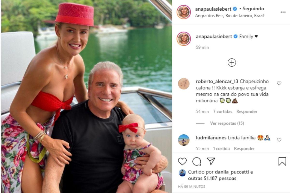 A modelo e influenciadora digital Ana Paula Siebert usou as redes sociais neste domingo, 13 de novembro, para compartilhar uma foto cheia de amor ao lado da filha, Vicky e do marido, o empresário e apresentador Roberto Justus. Na imgem, os três apareceram sorrindo durante um passeio de barco em Angra dos Reis. “Família”, escreveu a famosa ao publicar a foto, em que ela e a filha aparecem com look combinando.