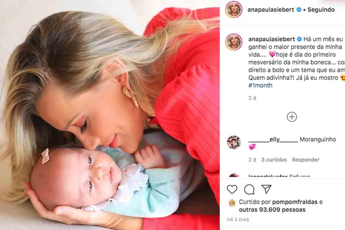 Ana Paula Siebert está celebrando o primeiro mês de vida da filha, Vicky, fruto de seu relacionamento com o empresário e apresentador Roberto Justus. “Há um mês eu ganhei o maior presente da minha vida… hoje é dia do primeiro mesversário da minha boneca… com direito a bolo e um tema que eu amo! Quem adivinha?! Já já eu mostro”, comentou a influenciadora.