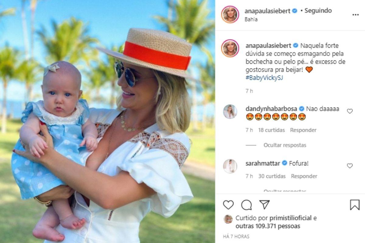 Ana Paula Siebert usou as redes sociais nesta sexta-feira, 4 de setembro, para compartilhar uma foto ao lado da filha, Vicky, fruto do relacionamento com o empresário e apresentador Roberto Justus. Na imagem, a famosa aparece segurando a filha no colo em uma praia da Bahia. Junto com à foto, ela fez um comentário sobre os pés e bochechas da bebê e os fãs amaram!