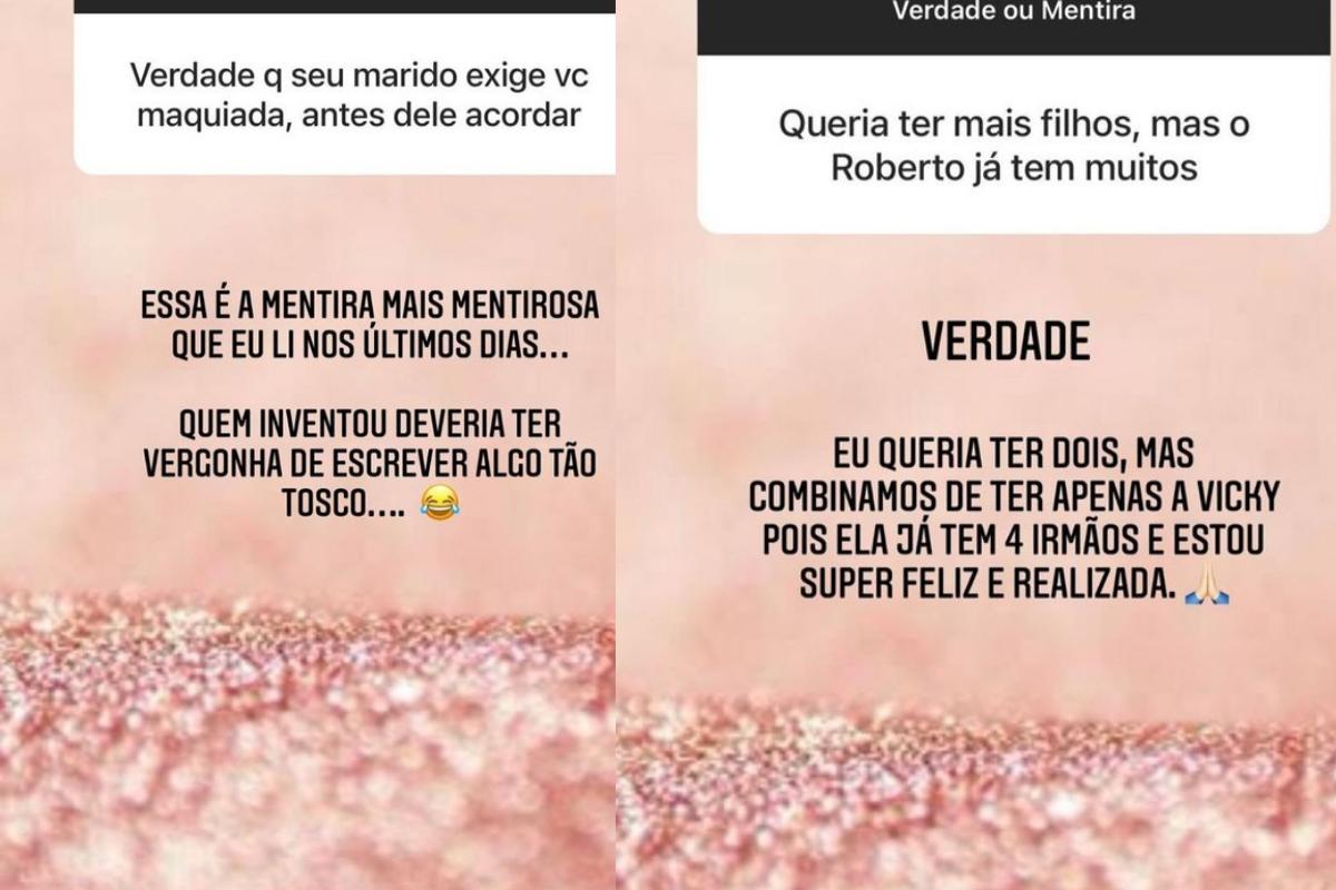 Acabou também com os rumores de que o apresentador traia ela. “Mentira. Confio muito no meu marido. Ele não é desse tipo! Mas… se souberem de algo, aceito por direct. @robertoljustus, todos os olhos em você!”, brincou a modelo.